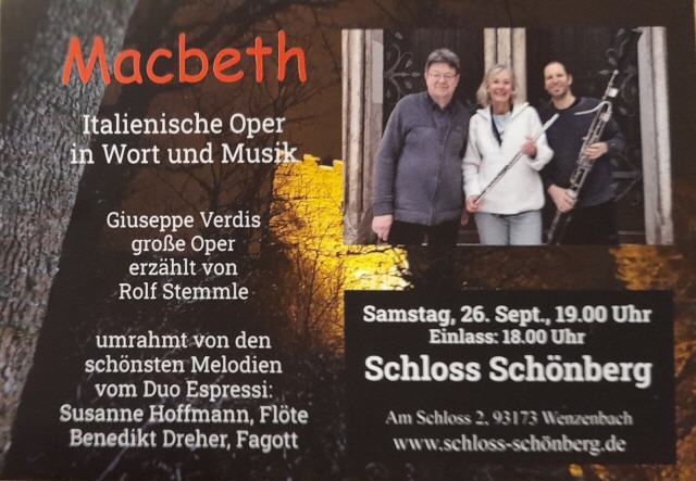 Rolf Stemmle hat die Geschehnisse zu einer spannenden Erzählung umgestaltet und die musikalischen Höhepunkte für Flöte und Fagott arrangiert. Zusammen mit den beiden Musikern Susanne Hoffmann und Benedikt Dreher („Duo Espressi“) wird er das literarisch-musikalische Programm in der mittelalterlichen Schlosshalle des stimmungsvollen Schloss Schönberg in Wenzenbach zur Aufführung bringen. Die perfekte Umgebung für unheimliche Szenen in schottischen Castles und leidenschaftliche Musik.